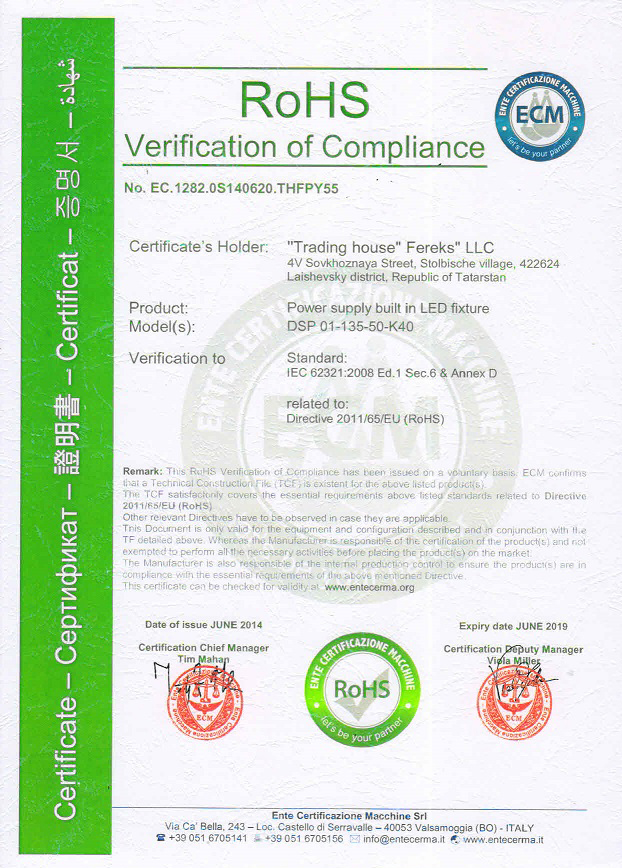 Торговый Дом «Ферекс» - ведущий производитель промышленных светодиодных светильников, дилером которого является Торговый дом "Гросс", получил сертификат на линию промышленных светильников серии ДСП.