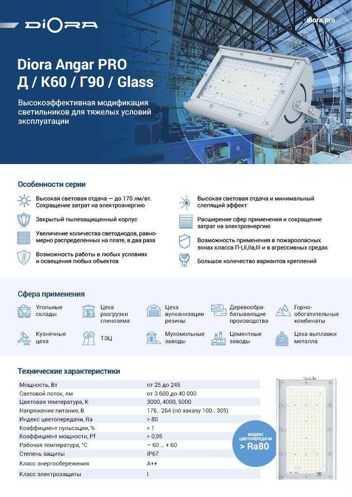Светильники для тяжелых условий эксплуатации Diora Angar PRO Д / К60 / Г90 / Glass